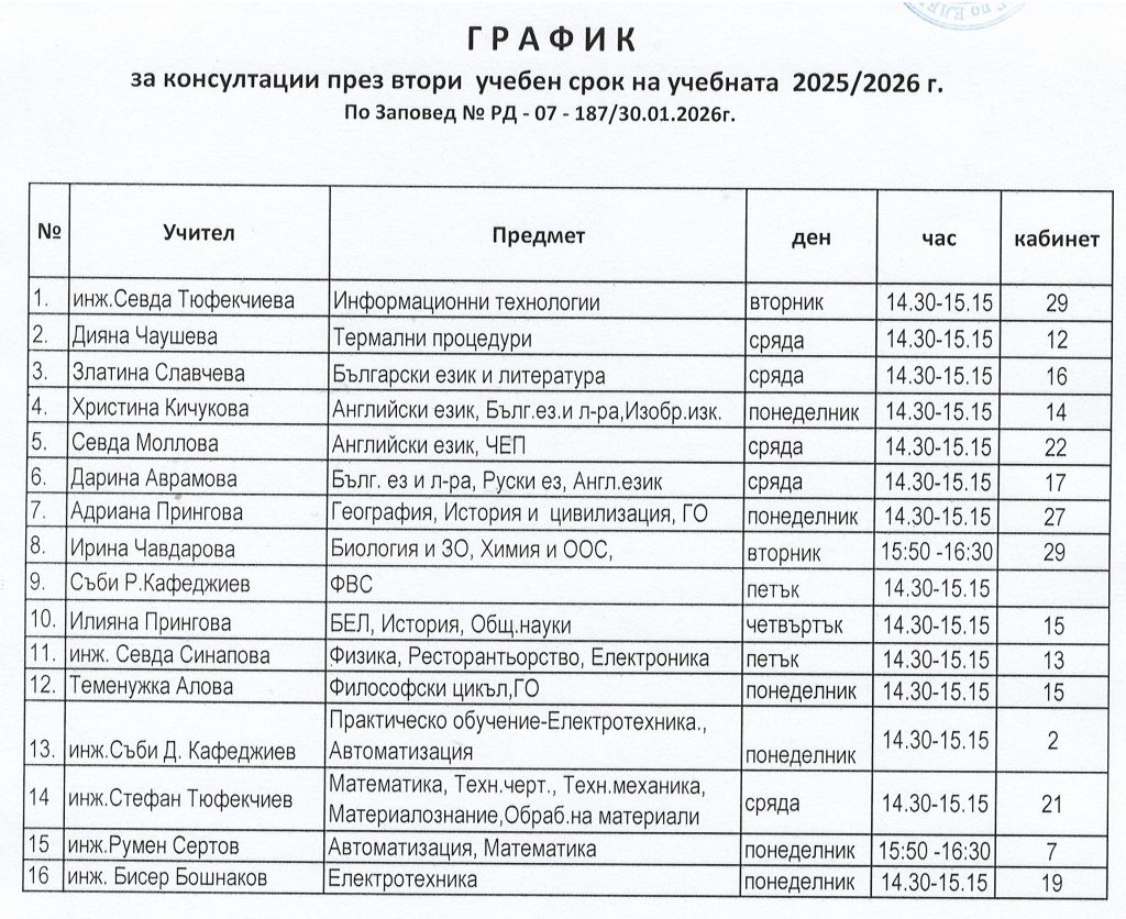 Втори час на класа, за работа с ученици и родители, се провежда всеки учебен вторник от 14:30 – 15:30 ч.